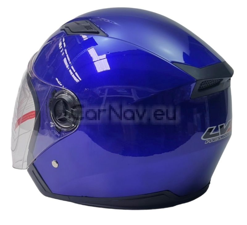 Синя защитна мото каска, проектирана за безопасност и комфорт при каране на мотоциклет или скутер. Осигурява надеждна защита на главата и стилен външен вид.