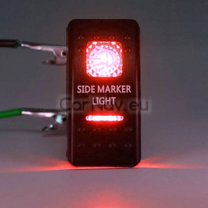 Бутон ON/OFF с надпис SIDE MARKER LIGHT и червена подсветка, подходящо за всички 12–24V акумулаторни инсталации.