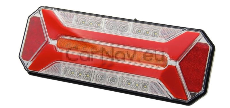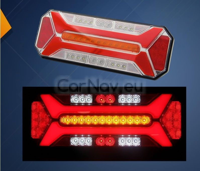 Многофункционален LED стоп с 5 светлинни функции и динамичен мигач, подходящ за камиони, ремаркета, платформи и други товарни превозни средства. Работи в диапазон 12–24V, което го прави универсално решение за различни видове инсталации.